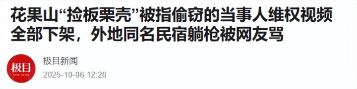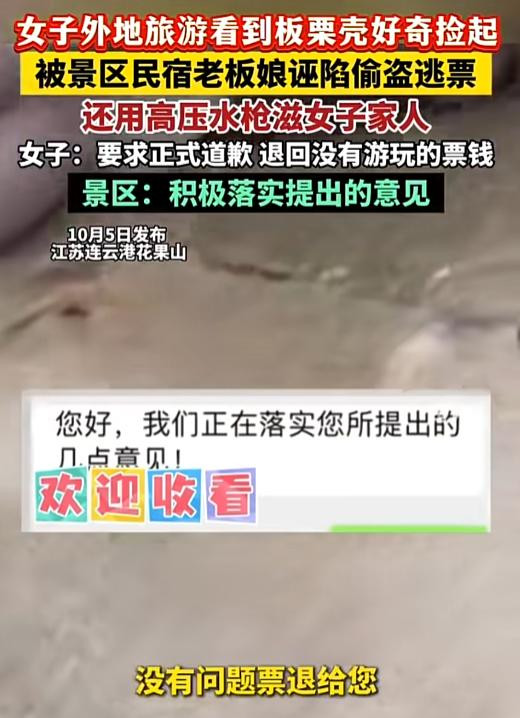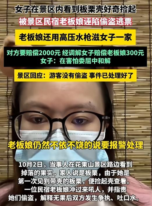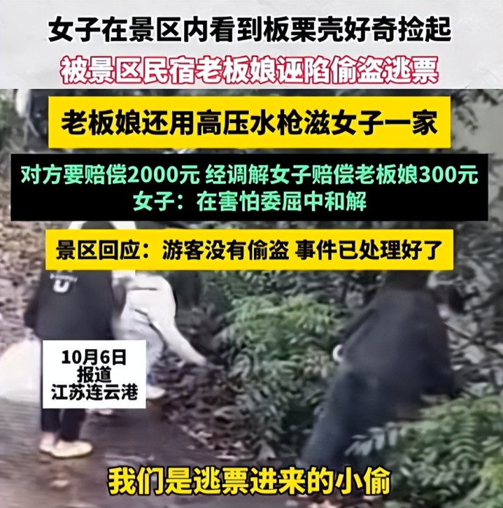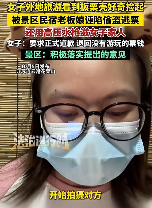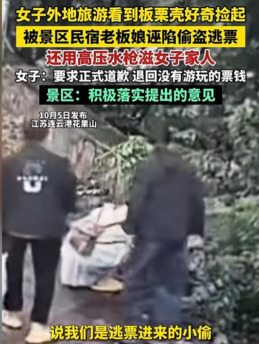 10月6日,有游客发布视频爆料,自家在花果山景区游玩时,仅仅因捡起地上的板栗壳,竟被一位民宿老板无端诬陷为偷盗与逃票。
