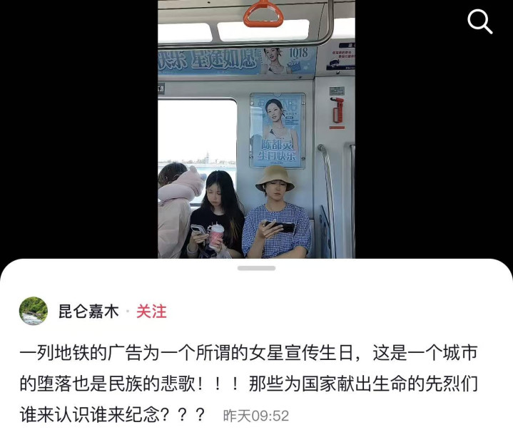 但是这位网友看了之后心里面就不舒服了,觉得地铁干嘛要为一个女明星宣传生日。所以他就认为这是一个城市的堕落也是民族的悲歌。那些为国家献出生命的先烈们谁来认识,谁来纪念?