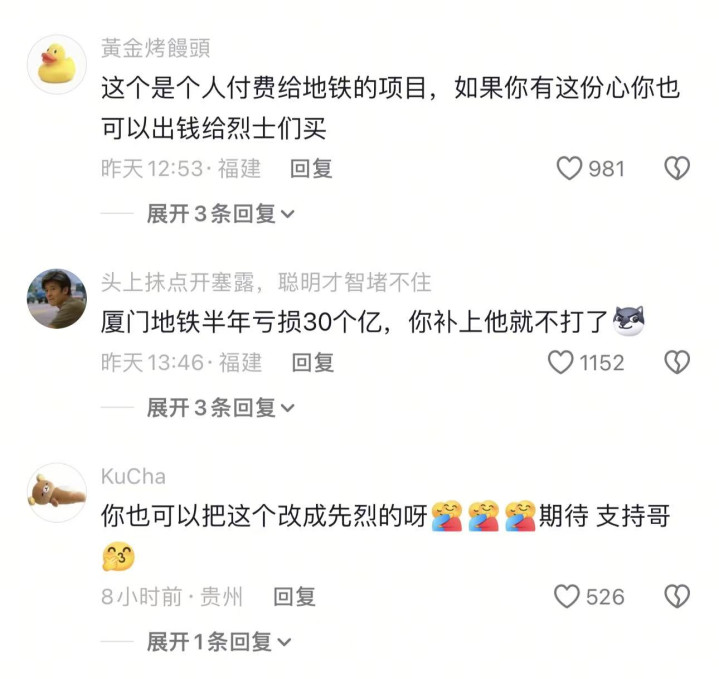 所以这位网友就认为地铁那边不能这样,应该把这些广告位用来宣传那些先烈,这样才对。但是这位网友的看法,却没有引起大家的认可。在评论区里,不少网友还对他调侃了起来。网友们就表示如果他有心就别在网上说,自己掏钱去把那些广告位改成先烈的。当然那些广告位价格非常的昂贵,怕是他也出不起这个钱。